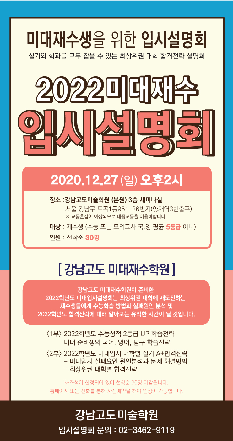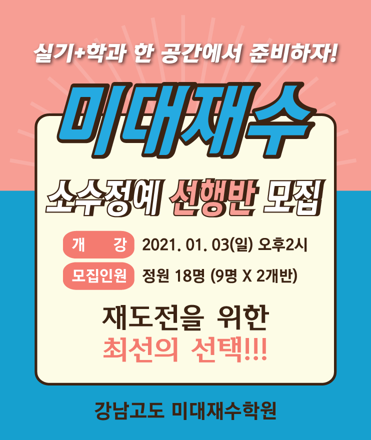Á¦¸ñ 2022 ¹Ì´ëÀç¼ö ¼±Çà¹Ý ÀԽü³¸íȸ ÀÛ¼ºÀÏÀÚ 2020-12-16 2022Çг⵵ Àç¼ö»ý ¹Ì´ëÀԽü³¸íȸ¹Ì´ëÀç¼ö ¼±Çà¹ÝÀ» À§ÇÑ ÀԽü³¸íȸ½Ç±â¿Í Çаú¸¦ ¸ðµÎ ÀâÀ» ¼ö ÀÖ´Â ÃÖ»óÀ§±Ç ´ëÇÐ ÇÕ°ÝÀü·« ¼³¸íȸ